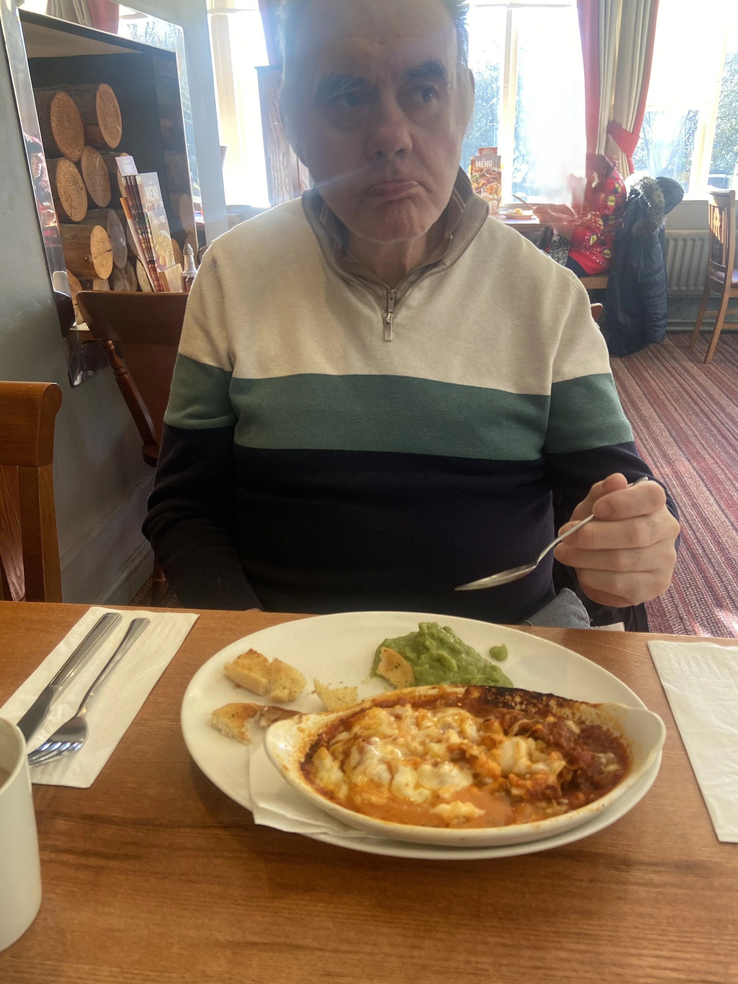 Melvyn and Donna enjoyed a trip over to Brighouse. They looked in the charity shops; Melvyn bought some cars and Snap cards. They then went to the Watermill for lunch and played Snap while waiting for their food. Melvyn enjoyed his lasagne, garlic bread, and mushy peas, and finished off with a cappuccino.
